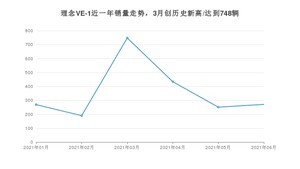 2021年6月,理念VE-1销量为271辆,同比增长22.62%,环比增长7.97%。1-6月份,理念VE-1销量为2163辆,同比增长161.23%。在最近1年中,理念VE-1销量在2021年03月达到最高,销量为748辆。