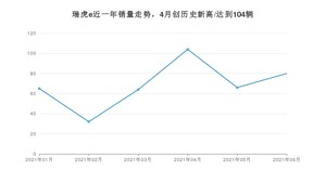 2021年6月,瑞虎e销量为80辆,同比下降44.83%,环比增长21.21%。1-6月份,瑞虎e销量为411辆,同比下降43.62%。在最近1年中,瑞虎e销量在2021年04月达到最高,销量为104辆。