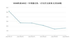 2021年6月,SWM斯威G05销量为160辆,同比下降61.81%,环比增长17.65%。1-6月份,SWM斯威G05销量为1566辆,同比下降44.78%。在最近1年中,SWM斯威G05销量在2021年01月达到最高,销量为520辆。