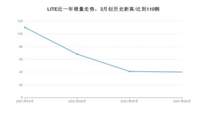 2021年6月,LITE销量为40辆,同比下降38.46%,环比下降2.44%。1-6月份,LITE销量为259辆,同比下降35.41%。在最近1年中,LITE销量在2021年03月达到最高,销量为110辆。