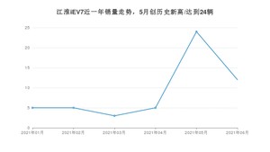 2021年6月,江淮iEV7销量为12辆,同比下降40%,环比下降50%。1-6月份,江淮iEV7销量为54辆,同比下降27.03%。在最近1年中,江淮iEV7销量在2021年05月达到最高,销量为24辆。