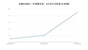 2021年6月,启腾EX80销量为9辆,同比增长200%,环比增长350%。1-6月份,启腾EX80销量为12辆,同比增长300%。在最近1年中,启腾EX80销量在2021年06月达到最高,销量为9辆。