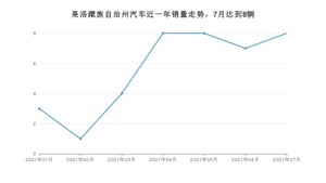 2021年7月,果洛藏族自治州汽车总销量为8辆,同比增长33.33%,环比增长14.29%。1-7月份,果洛藏族自治州总销量为39辆,同比增长39.29%。在最近1年中,果洛藏族自治州销量在2021年05月达到最高,销量为8辆。