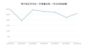 2021年7月,喀什地区汽车总销量为2620辆,同比增长21.02%,环比增长17.54%。1-7月份,喀什地区总销量为18140辆,同比增长26.75%。在最近1年中,喀什地区销量在2021年03月达到最高,销量为2934辆。