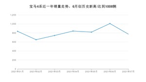 2021年7月,宝马4系销量为773辆,同比增长286.5%,环比下降23.31%。1-7月份,宝马4系销量为5669辆,同比增长95.35%。在最近1年中,宝马4系销量在2021年06月达到最高,销量为1008辆。