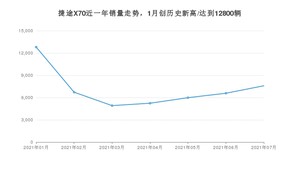 2021年7月,捷途X70销量为7588辆,同比增长218.16%,环比增长15.3%。1-7月份,捷途X70销量为49823辆,同比增长128.25%。在最近1年中,捷途X70销量在2021年01月达到最高,销量为12800辆。