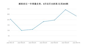 2021年7月,撼路者销量为233辆,同比增长18.88%,环比下降20.48%。1-7月份,撼路者销量为1318辆,同比增长92.13%。在最近1年中,撼路者销量在2021年06月达到最高,销量为293辆。