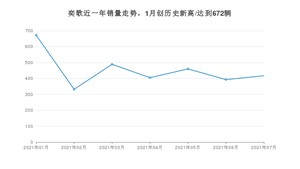 2021年7月,奕歌销量为417辆,同比下降38.13%,环比增长6.11%。1-7月份,奕歌销量为3168辆,同比下降47.09%。在最近1年中,奕歌销量在2021年01月达到最高,销量为672辆。
