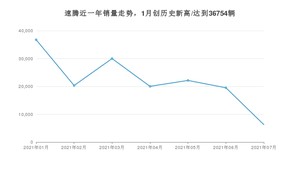 2021年7月,速腾销量为6273辆,同比下降73.28%,环比下降67.86%。1-7月份,速腾销量为155045辆,同比增长13.15%。在最近1年中,速腾销量在2021年01月达到最高,销量为36754辆。