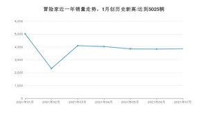 2021年7月,冒险家销量为3858辆,同比增长18.42%,环比增长0.52%。1-7月份,冒险家销量为27028辆,同比增长144.86%。在最近1年中,冒险家销量在2021年01月达到最高,销量为5025辆。