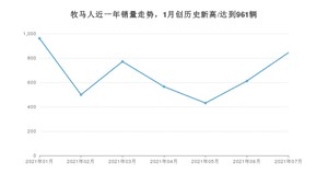 2021年7月,牧马人销量为844辆,同比增长0.84%,环比增长37.91%。1-7月份,牧马人销量为4683辆,同比增长7.48%。在最近1年中,牧马人销量在2021年01月达到最高,销量为961辆。