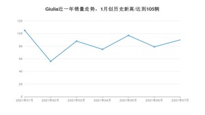 2021年7月,Giulia销量为90辆,同比下降7.22%,环比增长13.92%。1-7月份,Giulia销量为590辆,同比下降4.38%。在最近1年中,Giulia销量在2021年01月达到最高,销量为105辆。