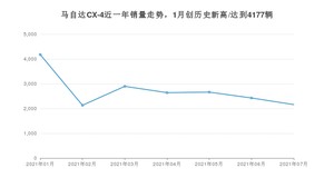 2021年7月,马自达CX-4销量为2159辆,同比下降53.37%,环比下降11.01%。1-7月份,马自达CX-4销量为19090辆,同比下降32.34%。在最近1年中,马自达CX-4销量在2021年01月达到最高,销量为4177辆。
