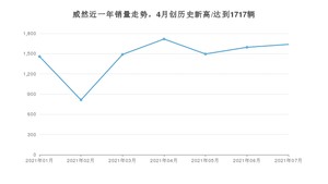 2021年7月,威然销量为1638辆,同比下降2.9%,环比增长2.7%。1-7月份,威然销量为10204辆,同比增长183.6%。在最近1年中,威然销量在2021年04月达到最高,销量为1717辆。