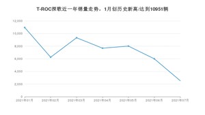 2021年7月,T-ROC探歌销量为2521辆,同比下降68.93%,环比下降57.94%。1-7月份,T-ROC探歌销量为50746辆,同比下降10.35%。在最近1年中,T-ROC探歌销量在2021年01月达到最高,销量为10951辆。