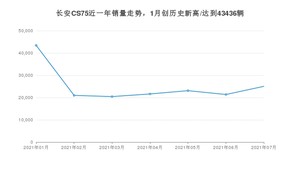 2021年7月,长安CS75销量为25030辆,同比增长13.76%,环比增长17.13%。1-7月份,长安CS75销量为175960辆,同比增长40.58%。在最近1年中,长安CS75销量在2021年01月达到最高,销量为43436辆。