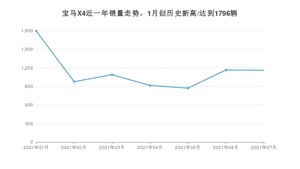 2021年7月,宝马X4销量为1162辆,同比增长75.79%,环比下降0.26%。1-7月份,宝马X4销量为7978辆,同比增长26.33%。在最近1年中,宝马X4销量在2021年01月达到最高,销量为1796辆。