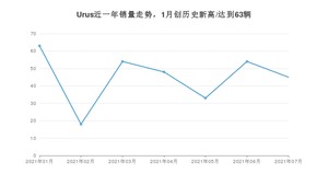 2021年7月,Urus销量为45辆,同比增长87.5%,环比下降16.67%。1-7月份,Urus销量为315辆,同比增长105.88%。在最近1年中,Urus销量在2021年01月达到最高,销量为63辆。