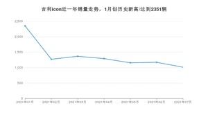 2021年7月,吉利icon销量为1011辆,同比下降50.02%,环比下降13.59%。1-7月份,吉利icon销量为9610辆,同比下降32.22%。在最近1年中,吉利icon销量在2021年01月达到最高,销量为2351辆。