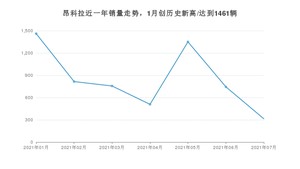 2021年7月,昂科拉销量为314辆,同比下降71.61%,环比下降57.8%。1-7月份,昂科拉销量为5949辆,同比下降11.84%。在最近1年中,昂科拉销量在2021年01月达到最高,销量为1461辆。