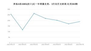 2021年7月,奔驰A级AMG(进口)销量为191辆,同比增长114.61%,环比增长12.35%。1-7月份,奔驰A级AMG(进口)销量为1416辆,同比增长758.18%。在最近1年中,奔驰A级AMG(进口)销量在2021年03月达到最高,销量为263辆。