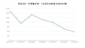 2021年7月,探岳X销量为550辆,同比下降38.82%,环比下降27.82%。1-7月份,探岳X销量为8614辆,同比增长781.68%。在最近1年中,探岳X销量在2021年01月达到最高,销量为1917辆。