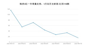 2021年7月,瑞虎3销量为15辆,同比下降95.77%,环比下降55.88%。1-7月份,瑞虎3销量为362辆,同比下降87.87%。在最近1年中,瑞虎3销量在2021年01月达到最高,销量为116辆。