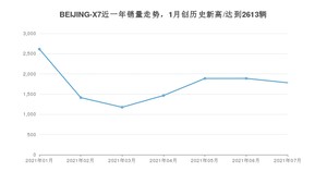 2021年7月,BEIJING-X7销量为1781辆,同比增长24.63%,环比下降5.62%。1-7月份,BEIJING-X7销量为12220辆,同比增长699.22%。在最近1年中,BEIJING-X7销量在2021年01月达到最高,销量为2613辆。