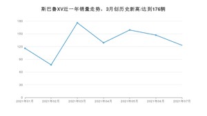 2021年7月,斯巴鲁XV销量为123辆,同比下降24.07%,环比下降16.33%。1-7月份,斯巴鲁XV销量为927辆,同比增长4.04%。在最近1年中,斯巴鲁XV销量在2021年03月达到最高,销量为176辆。