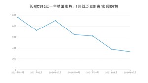 2021年7月,长安CS15销量为333辆,同比下降52.29%,环比下降12.37%。1-7月份,长安CS15销量为4547辆,同比下降15.14%。在最近1年中,长安CS15销量在2021年01月达到最高,销量为957辆。