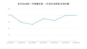 2021年7月,宝马X4 M销量为40辆,同比增长17.65%,环比持平。1-7月份,宝马X4 M销量为243辆,同比增长25.26%。在最近1年中,宝马X4 M销量在2021年01月达到最高,销量为41辆。