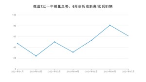 2021年7月,微蓝7销量为61辆,同比增长335.71%,环比下降24.69%。1-7月份,微蓝7销量为347辆,同比增长1%。在最近1年中,微蓝7销量在2021年06月达到最高,销量为81辆。