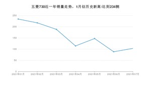 2021年7月,五菱730销量为103辆,同比下降61.57%,环比增长17.05%。1-7月份,五菱730销量为1091辆,同比增长3.31%。在最近1年中,五菱730销量在2021年01月达到最高,销量为234辆。