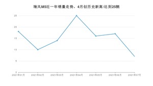 2021年7月,瑞风M5销量为7辆,同比增长16.67%,环比下降58.82%。1-7月份,瑞风M5销量为107辆,同比增长75.41%。在最近1年中,瑞风M5销量在2021年04月达到最高,销量为25辆。