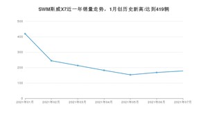 2021年7月,SWM斯威X7销量为178辆,同比增长2.3%,环比增长5.95%。1-7月份,SWM斯威X7销量为1557辆,同比增长93.66%。在最近1年中,SWM斯威X7销量在2021年01月达到最高,销量为419辆。