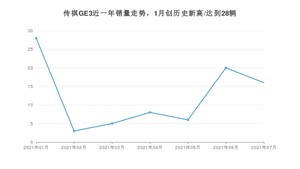2021年7月,传祺GE3销量为16辆,同比下降74.6%,环比下降20%。1-7月份,传祺GE3销量为86辆,同比下降82.52%。在最近1年中,传祺GE3销量在2021年01月达到最高,销量为28辆。