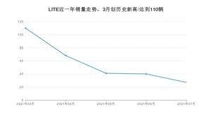 2021年7月,LITE销量为27辆,同比下降10%,环比下降32.5%。1-7月份,LITE销量为286辆,同比下降33.64%。在最近1年中,LITE销量在2021年03月达到最高,销量为110辆。