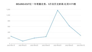 2021年7月,BEIJING-EU7销量为281辆,同比增长116.15%,环比下降54.97%。1-7月份,BEIJING-EU7销量为2875辆,同比增长171.23%。在最近1年中,BEIJING-EU7销量在2021年05月达到最高,销量为1171辆。