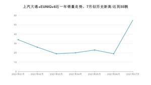 2021年7月,上汽大通 EUNIQ 6销量为55辆,同比增长1%,环比增长189.47%。1-7月份,上汽大通 EUNIQ 6销量为196辆,同比增长2%。在最近1年中,上汽大通 EUNIQ 6销量在2021年07月达到最高,销量为55辆。