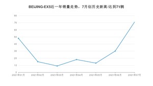 2021年7月,BEIJING-EX5销量为71辆,同比增长144.83%,环比增长136.67%。1-7月份,BEIJING-EX5销量为204辆,同比下降20.62%。在最近1年中,BEIJING-EX5销量在2021年07月达到最高,销量为71辆。
