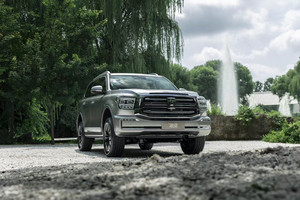 侧面采用了非常圆润饱满的设计,没有明显的腰线,车顶采用了非常平直的设计,配备有行李架,前后侧翼子板微微向外凸出,搭配密条辐大尺寸轮圈,进一步凸显豪华气场。