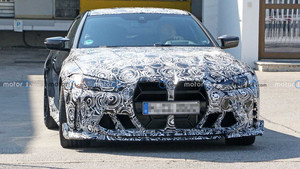 从谍照上看,此次新车向我们展示了更多的细节,整车的设计非常有侵略性,拥有与M4相似的巨大双肾进气格栅,但内部装饰不再是横幅式设计,比起M4更加复杂,可以预料到其将拥有更加复杂的空气力学设计,车辆的前保险杠下方设计了多个进气口,增加了新的前唇,进一步提升车头的下压力。
