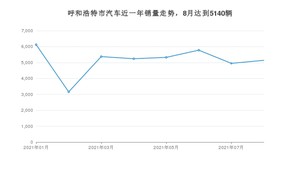 2021年8月,呼和浩特市汽车总销量为5140辆,同比增长3.23%,环比增长3.84%。1-8月份,呼和浩特市总销量为41090辆,同比增长28.75%。在最近1年中,呼和浩特市销量在2021年01月达到最高,销量为6125辆。