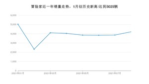 2021年8月,冒险家销量为4209辆,同比增长16.59%,环比增长9.1%。1-8月份,冒险家销量为31237辆,同比增长113.25%。在最近1年中,冒险家销量在2021年01月达到最高,销量为5025辆。
