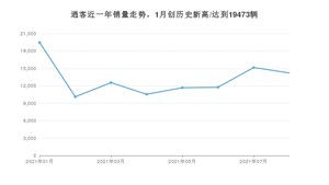 2021年8月,逍客销量为14224辆,同比增长5.03%,环比下降6.24%。1-8月份,逍客销量为105558辆,同比增长24.56%。在最近1年中,逍客销量在2021年01月达到最高,销量为19473辆。