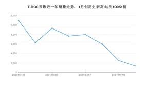 2021年8月,T-ROC探歌销量为1400辆,同比下降85.98%,环比下降44.47%。1-8月份,T-ROC探歌销量为52146辆,同比下降21.7%。在最近1年中,T-ROC探歌销量在2021年01月达到最高,销量为10951辆。