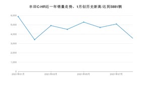 2021年8月,丰田C-HR销量为3558辆,同比下降21.39%,环比下降30.03%。1-8月份,丰田C-HR销量为37361辆,同比增长5.73%。在最近1年中,丰田C-HR销量在2021年01月达到最高,销量为5881辆。