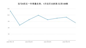 2021年8月,宝马8系销量为83辆,同比下降19.42%,环比下降24.55%。1-8月份,宝马8系销量为824辆,同比增长40.37%。在最近1年中,宝马8系销量在2021年01月达到最高,销量为139辆。