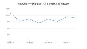 2021年8月,标致408销量为1074辆,同比增长95.63%,环比下降5.79%。1-8月份,标致408销量为8260辆,同比增长49.83%。在最近1年中,标致408销量在2021年01月达到最高,销量为1298辆。