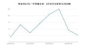 2021年8月,奥迪RS 7销量为5辆,同比增长66.67%,环比下降44.44%。1-8月份,奥迪RS 7销量为98辆,同比增长276.92%。在最近1年中,奥迪RS 7销量在2021年06月达到最高,销量为25辆。
